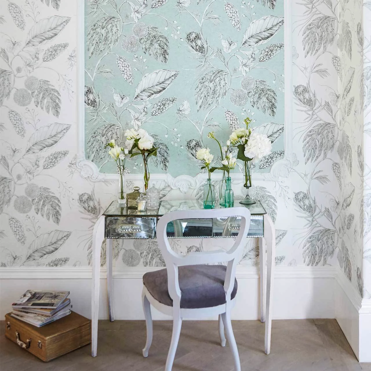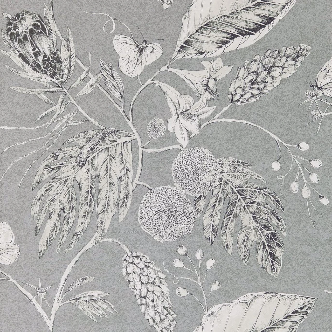Harlequin Palmetto 111223 Amborella wallpaper a ravishing display of botanical elements. Set in a textured and metallic background in hue of Steel.