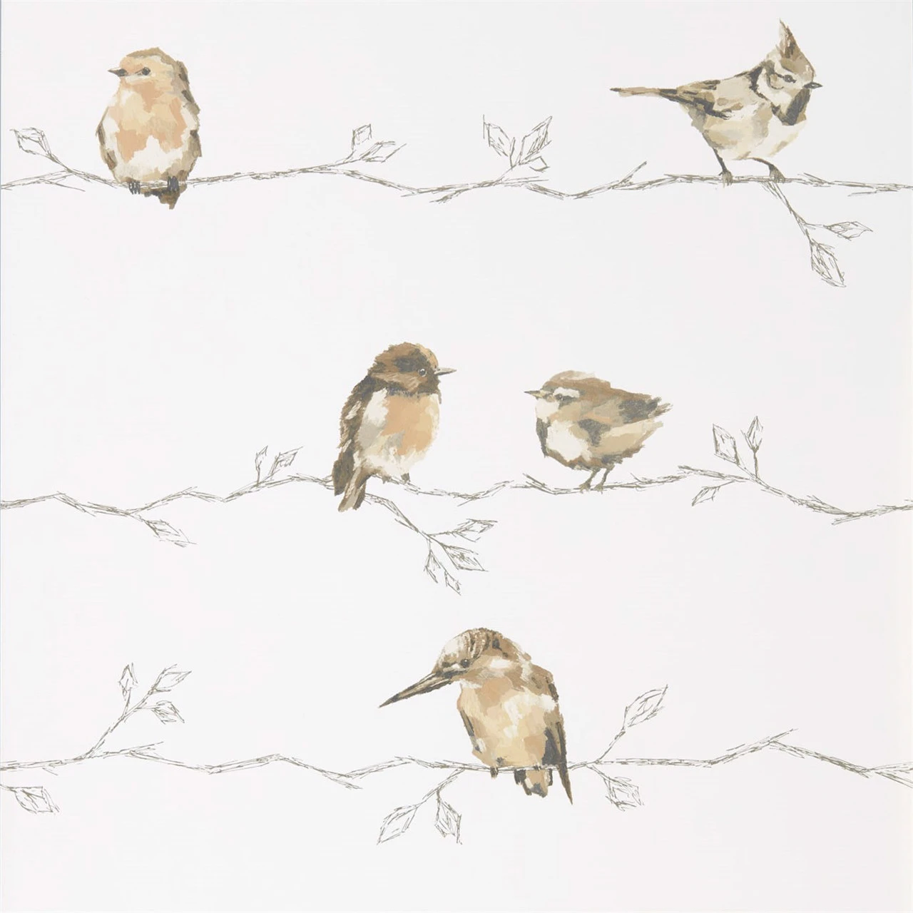 Harlequin Standing Ovation 111484 Persico wallpaper perfect for bird lovers. Featuring exquisite paintings of charming birds peacefully perched on branches. Represented in calming hues of Neutral and Chalk.