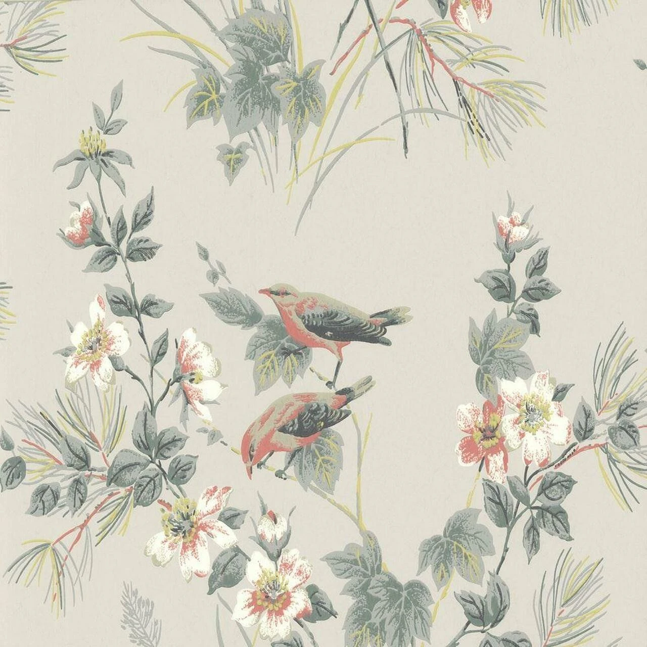 1601-100-05 Rosemore Wallpaper By 1838 Wallcoverings features one of their historic designs which has been reinvented with a new contemporary colour palette and a hand painted look. Rosemore wallpaper has a stylish country cottage feel, celebrating what nature has to offer and featuring colourful blossoms and birds, shown here in Grey with coral, warm yellow and tones of dusky green.