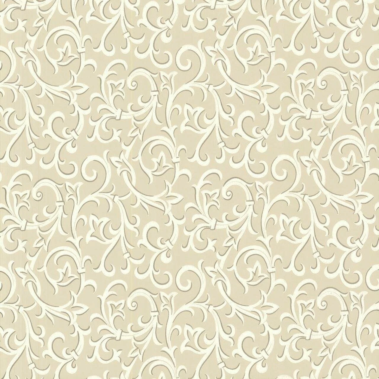 1602-103-01 Brodsworth Avington Wallpaper By 1838 Wallcoverings features a classic small scale scroll design printed in a neutral colour palette adding a graceful elegance to this curling and entwining scroll motif, shown here in Natural, an ivory scroll edged in metallic gilver and set against a matt background.