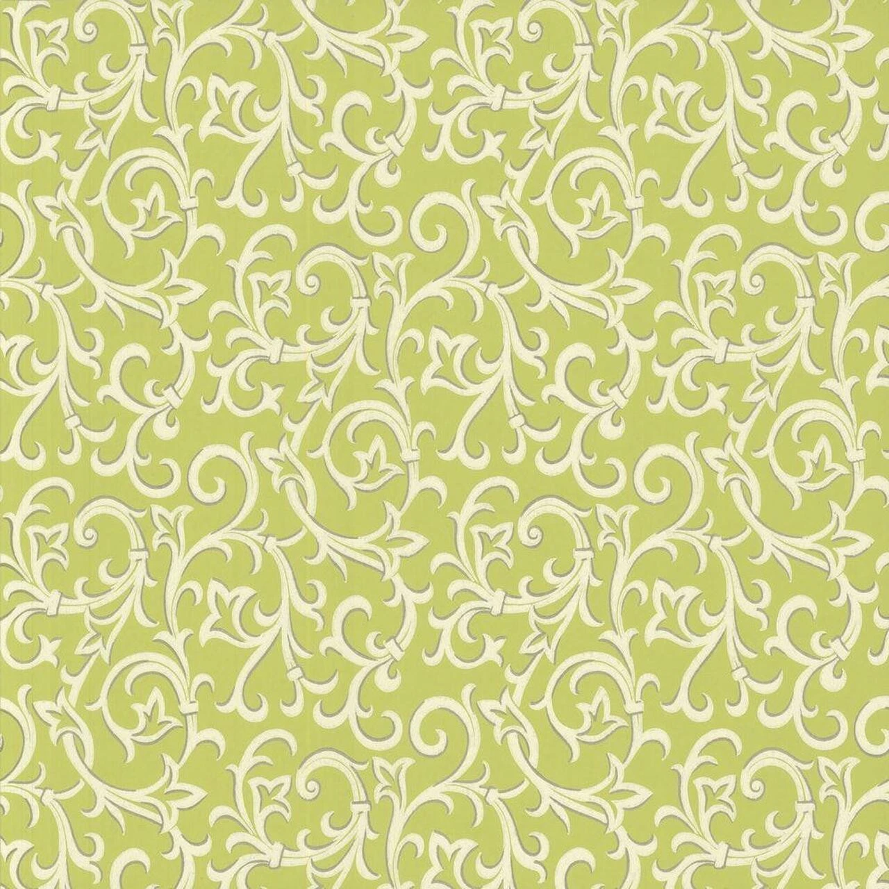 1602-103-05 Brodsworth Avington Wallpaper By 1838 Wallcoverings features a classic small scale scroll design printed in a neutral colour palette adding a graceful elegance to this curling and entwining scroll motif, shown here in Lime, an ivory scroll edged in metallic silver and set against a lime background with a matt finish.