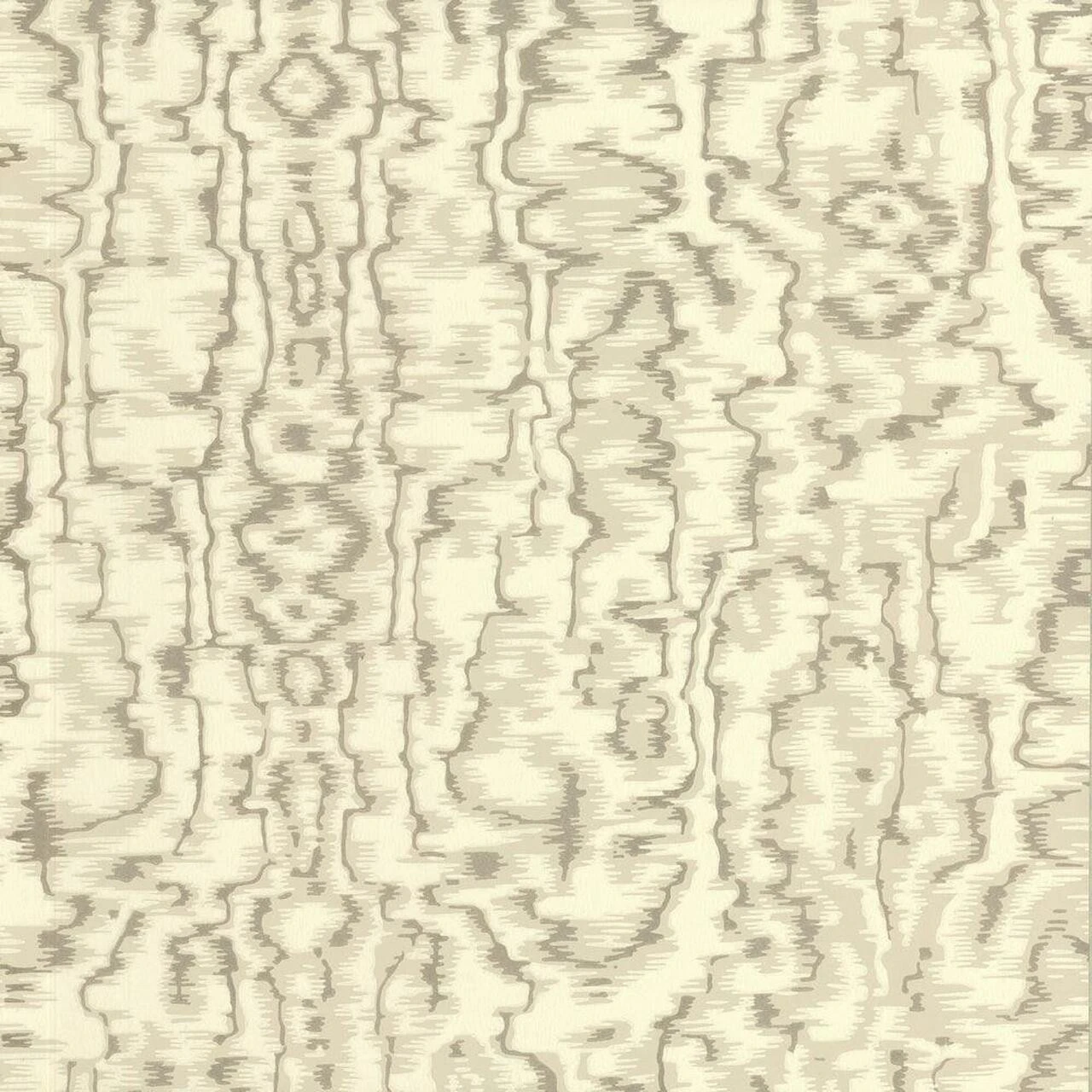 1602-105-01 Avington Wallpaper By 1838 Wallcoverings features a beautiful and versatile Moire design, a rippled effect pattern creating a serene and distinct watermark design, shown here in Natural, shades of cream with metallic detailing.