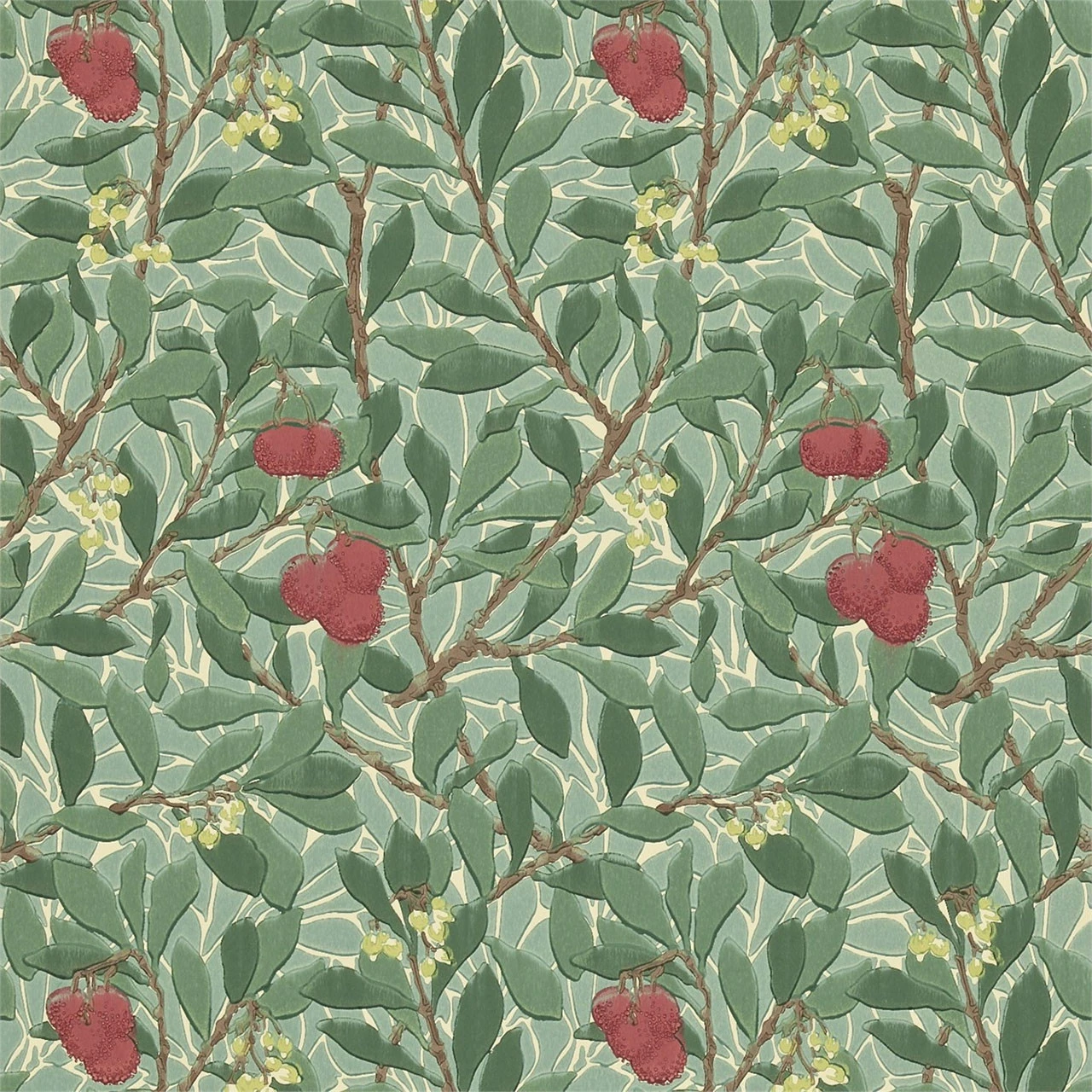 210406 Arbutus Wallpaper from the Compendium I & II collection by Morris & Co has been faithfully reproduced from the original Kathleen Kersey design created on the eve of World War I and is a delightful print featuring an all over design of stems, leaves and berries, shown here in Green and Red.