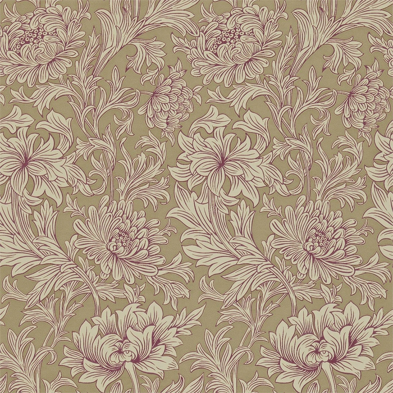 210416 Chrysanthemum Toile wallpaper from the Compendium I & II collections by Morris & Co features a pretty all over engraved Chrysanthemum floral design, shown here in Grape and Bronze.