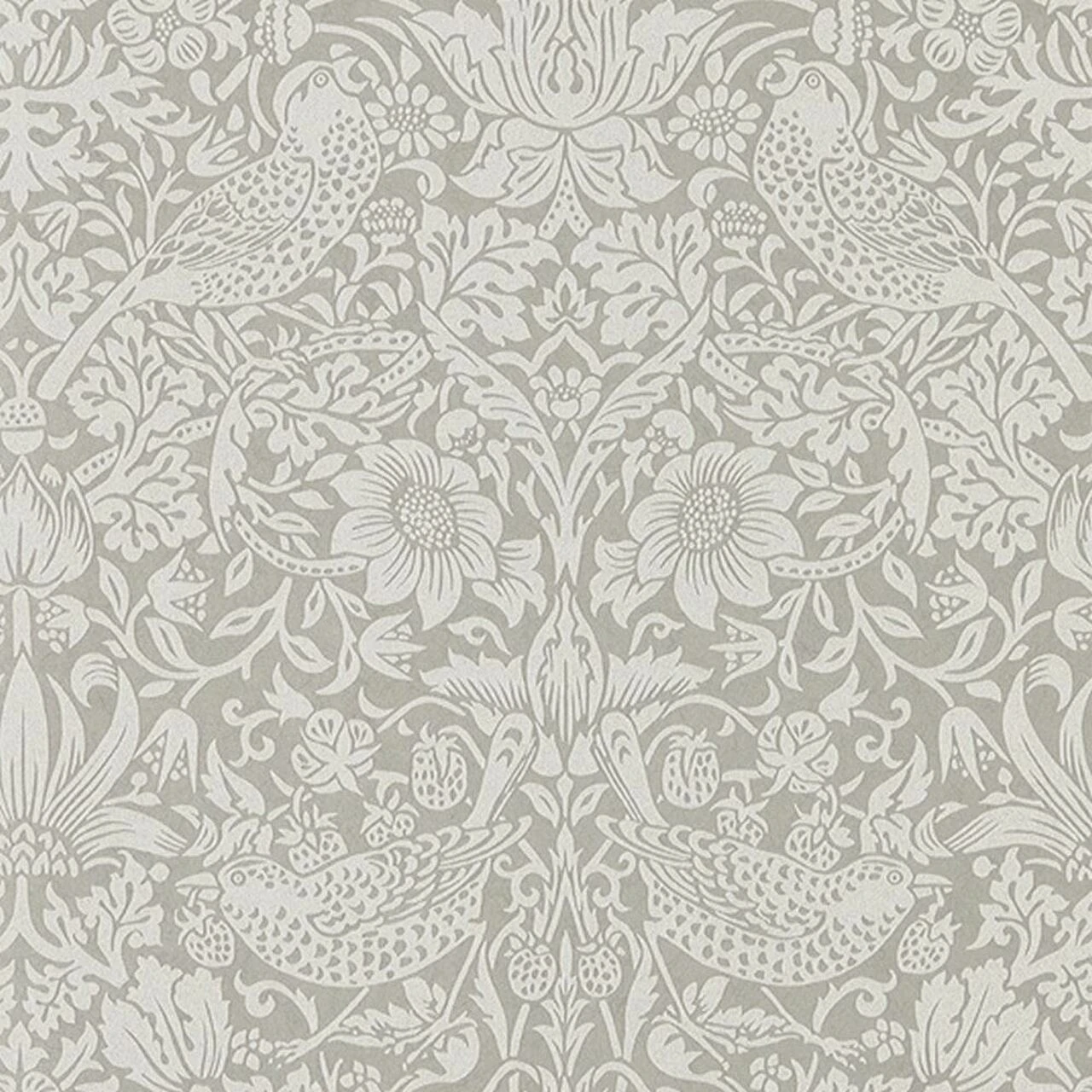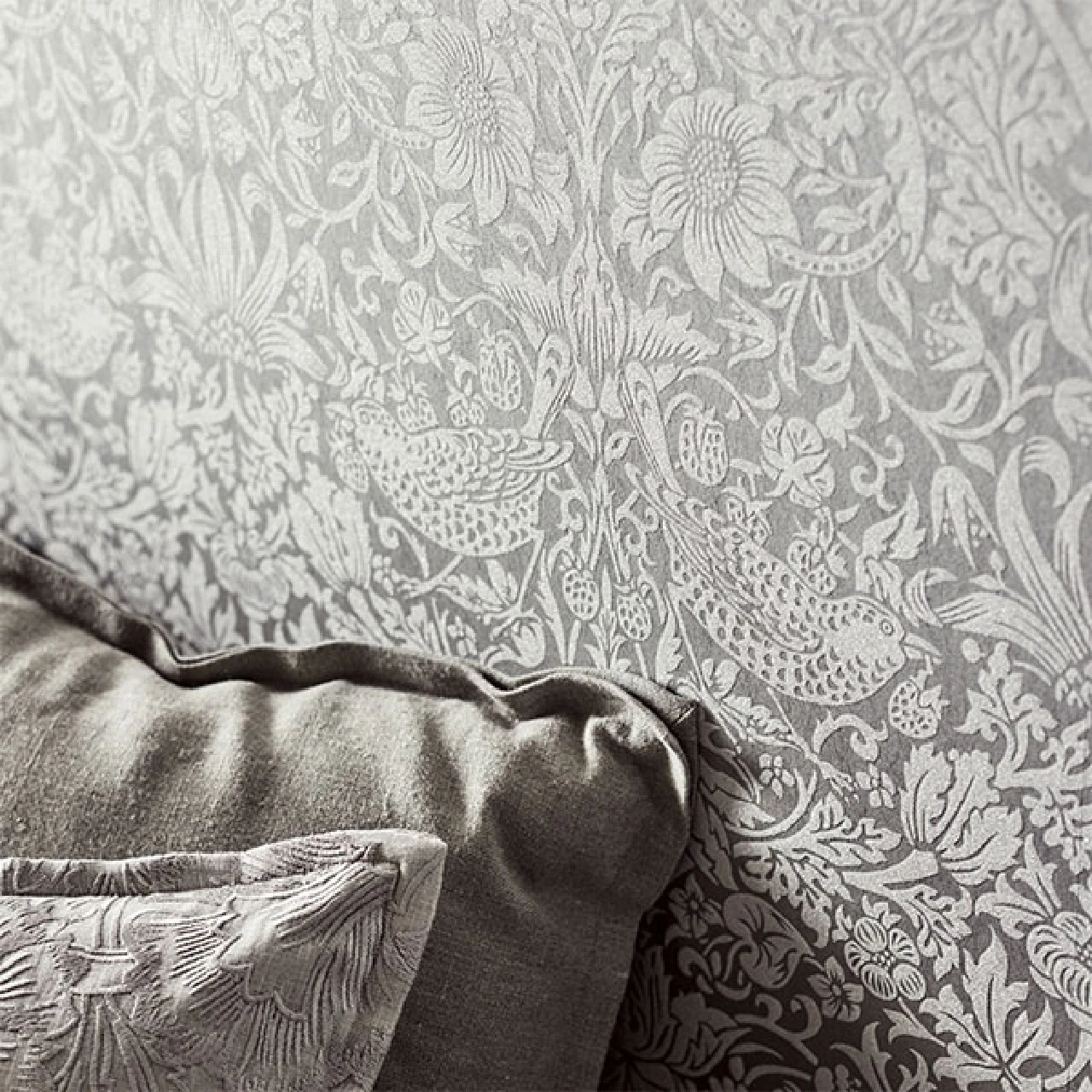 Strawberry Thief wallpaper by Morris & Co is an iconic design created by William Morris, dating back to 1833. The Strawberry Thief wallpaper design is a playful depiction of cheeky birds pecking at strawberries amongst vines and shrubbery. William Morris originally created Strawberry Thief to reflect the struggle gardeners have with birds eating their fruits. At Kelmscott Manor, after his attempts to grow strawberries William Morris experienced the same problem! Expertly replicated as a wallpaper print by Morris & Co, 216017 Pure Strawberry Thief wallpaper has been enhanced with delicate glass beading to add an opulent feel to this captivating design, shown here in Silver and Stone.