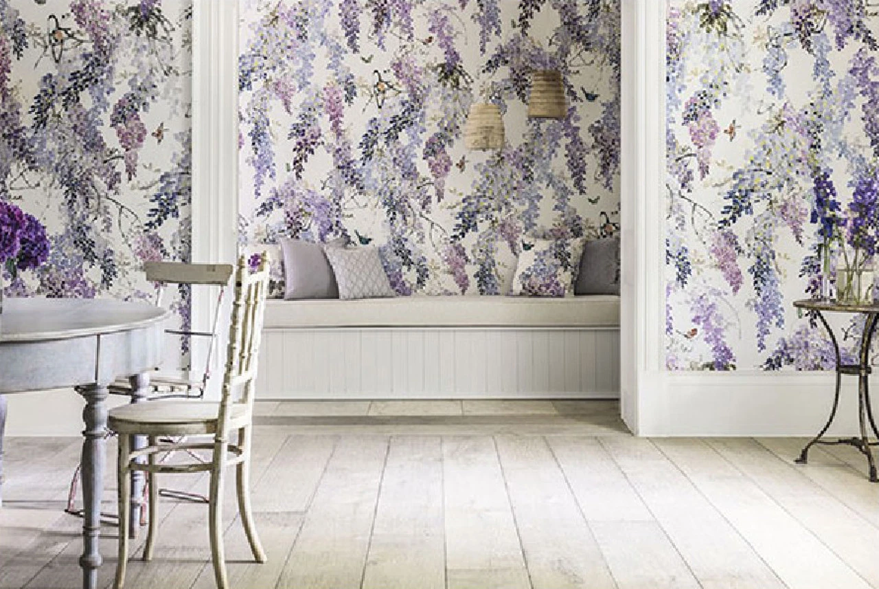 Sanderson Wisteria Falls is sold in panels of 3m length by 137cm wide and are supplied as a left and right panel. They can be used independently as a single panel or joined to create one large continuous panel. The Wisteria Falls Panel is supplied untrimmed and we recommend that a professional decorator with experience of hand trimming is used to hang these papers.
