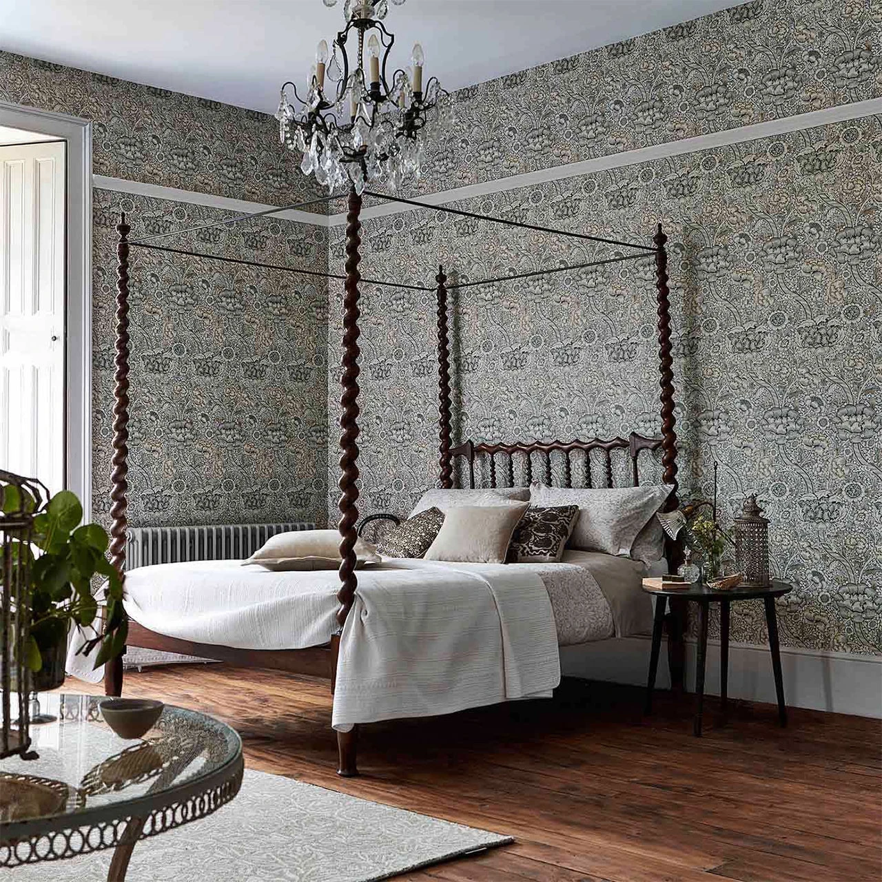 First produced in 1884, 216420 Wandle Archive IV – The Collector Wallpapers By Morris & Co features an intricate design with a striped meandering diagonal floral pattern, shown here in Wine and Saffron.