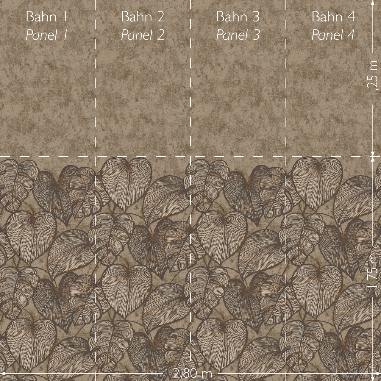 The wallpaper is supplied in four strips, each 70cm wide, that adjoin each other. The total size of the mural is 280cm wide and 300cm high.