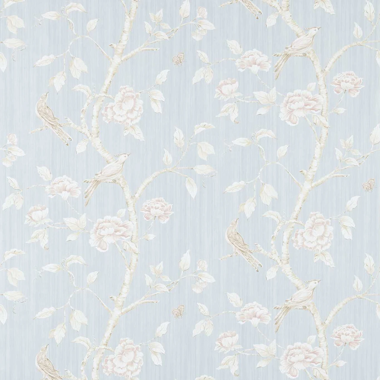 Introduce classic style to the interior with 311346 Woodville Manor wallpaper by Zoffany. Featuring a classic chinoiserie print depicting peony trails, blossoms and birds designed by mural artist Rosie Mennem. The Woodville Manor wallpaper has been rotary printed to add depth and interest to the interior. Shown here in La Seine.