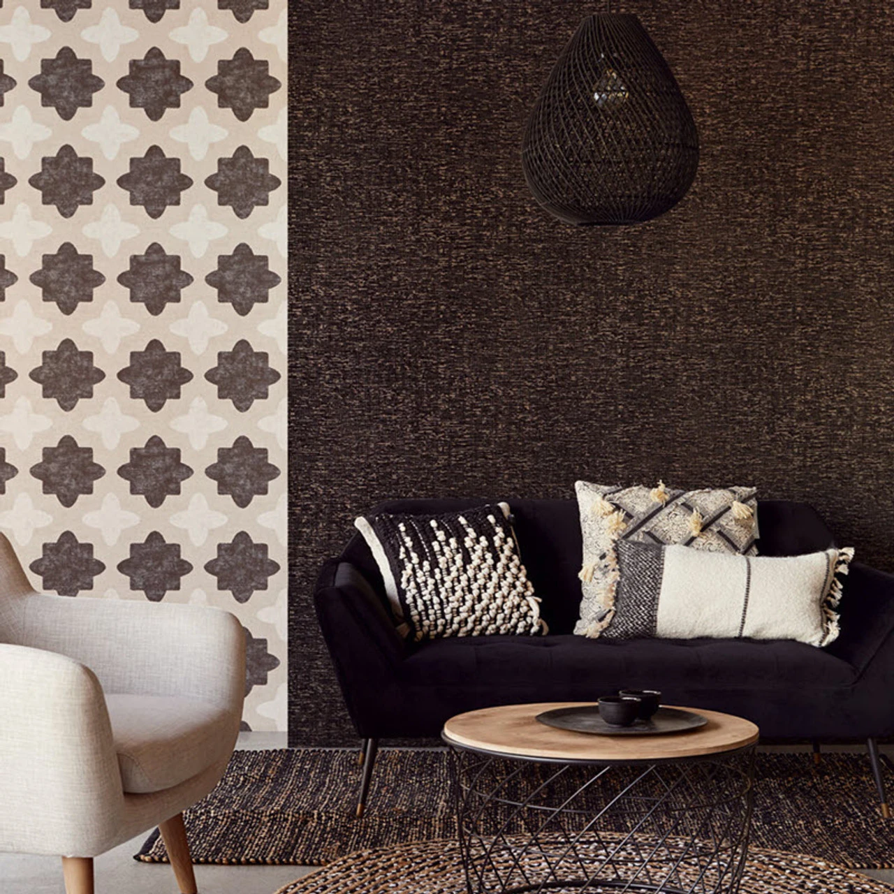 388742 Bring a boho chic vibe into your home interior with 388742 Lounge Wallpaper By Eijffinger featuring a distressed effect motif designer wallpaper shown here in shades of black, beige and cream.