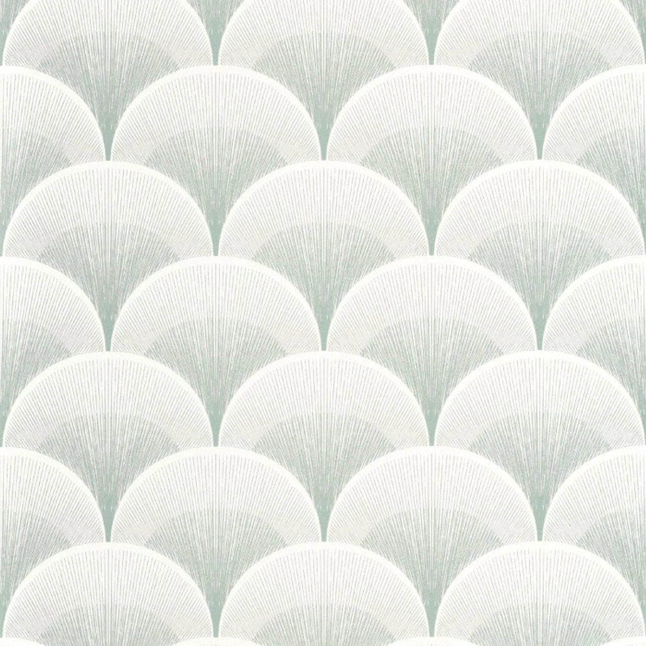 88667111 Twenties Broadway wallpaper takes inspiration from the curtain calls of 5th Avenue theatres; a spectacular design with rounded fan-like detail enhanced with iridescent lines which catch the light adding a glamorous feel, shown here in Vert Amande.