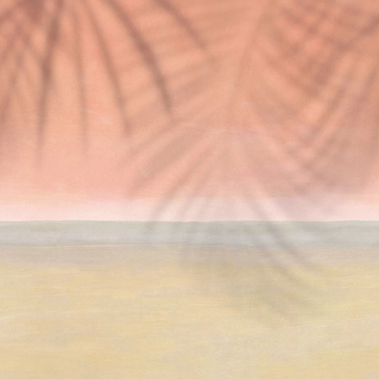 Golden sands stretch before you reaching out to the still Pacific Ocean on the horizon with shadows of palm trees against a beautiful sunset.