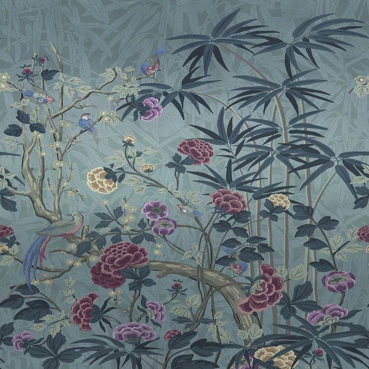 DAD23281 The Luxe Garden Mural Luxe Wallpaper by Galerie is a captivating Chinoiserie inspired wall mural featuring exotic birds and colourful trailing florals. Set against a backdrop of shadowy leaves and florals, The Luxe Garden Mural is presented in four luxurious colourways and can be matched and repeated around the room as required, shown here in shades including light blue.