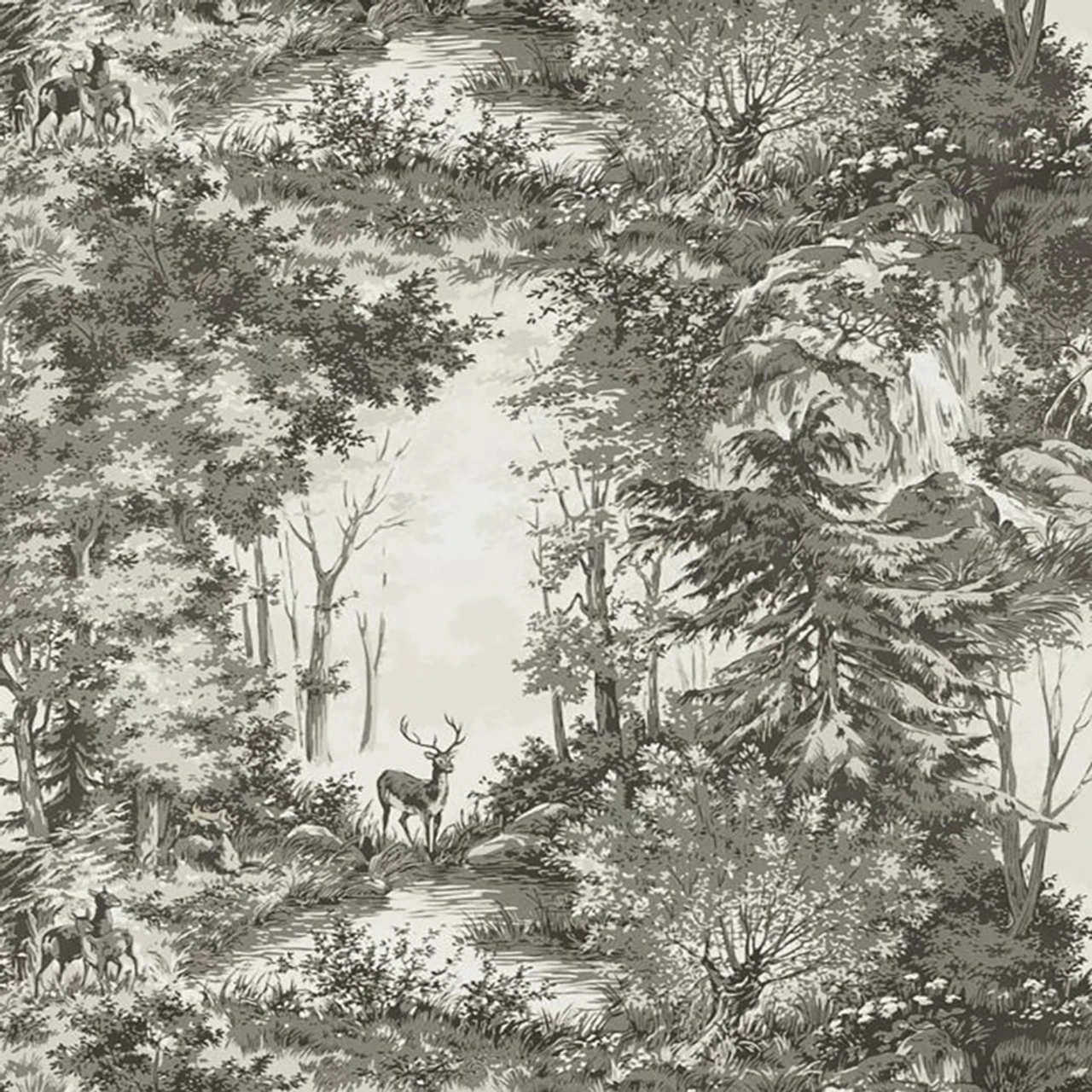 FG076A15 Torridon Woodsmoke Modern Country Wallpaper By Mulberry Home. Create a classic country interior with this charming scenic print of a woodland glade, depicting deer grazing in a lush forest, shown here in Woodsmoke.