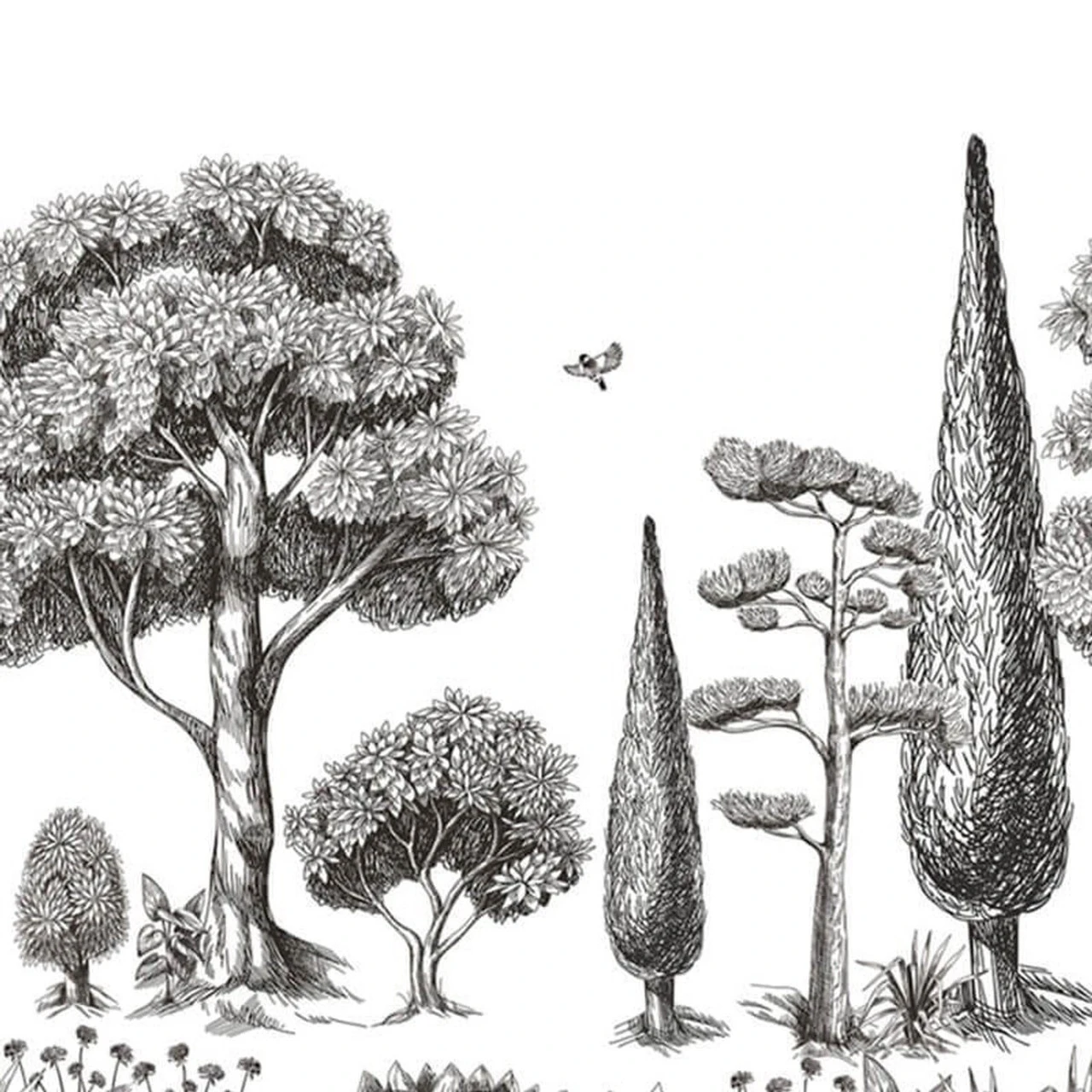 Head to the Mediterranean with 104130923 Menton Mural from the Moonlight 2 wallpaper collection by Caselio featuring a variety of trees and birds presented in sepia tones and shown here in Noir et Blanc.