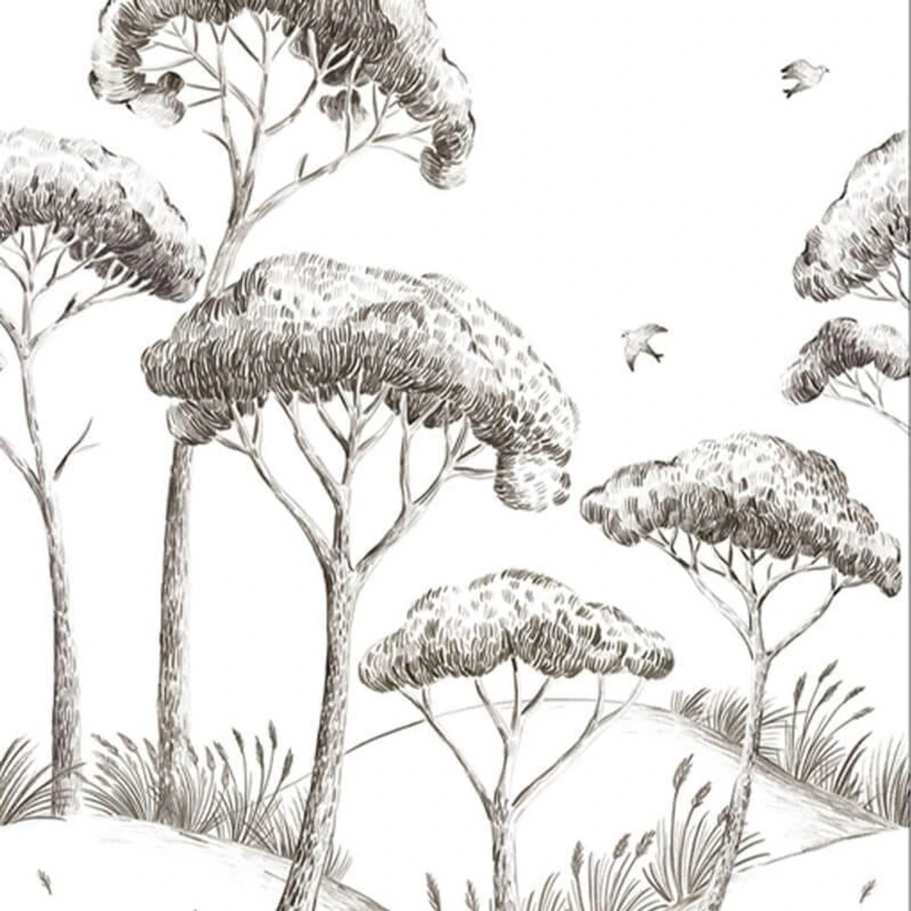 Majestic pine trees stretch along this hilly landscape, 104170967 Pinea Mural from the Moonlight 2 wallpaper collection by Caselio is a graceful design with a hand-drawn sketched effect and presented in sepia tones, shown here in Blanc Noir.