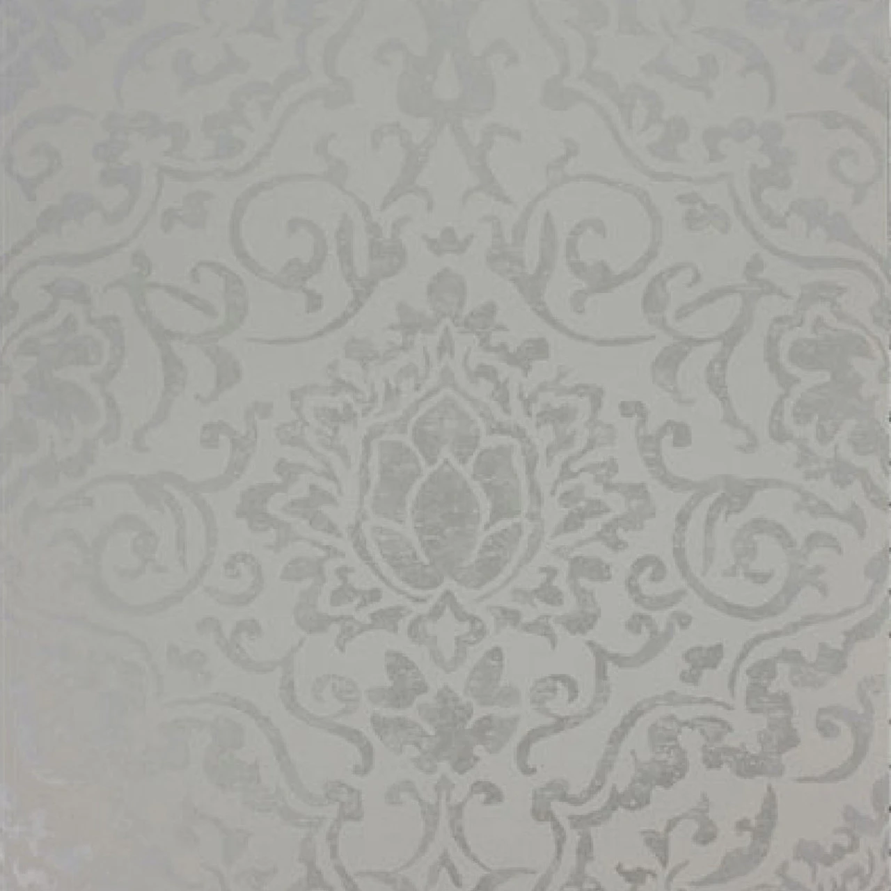 NCW4201-03 Belem Fontibre Wallpaper by Nina Campbell features an all over distressed damask design with subtle metallic highlights, shown here in Grey and Silver.