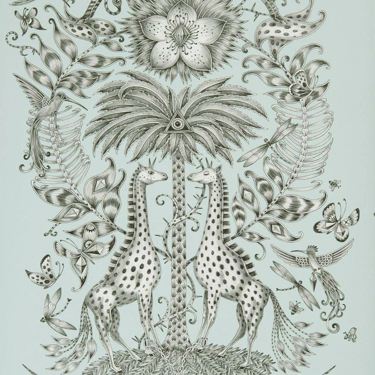 W0102/01 Kruger Animalia Wallpaper by Emma J Shipley for Clarke & Clarke is inspired by a safari adventure featuring a fantastical array of creatures and foliage, shown here in Eggshell.