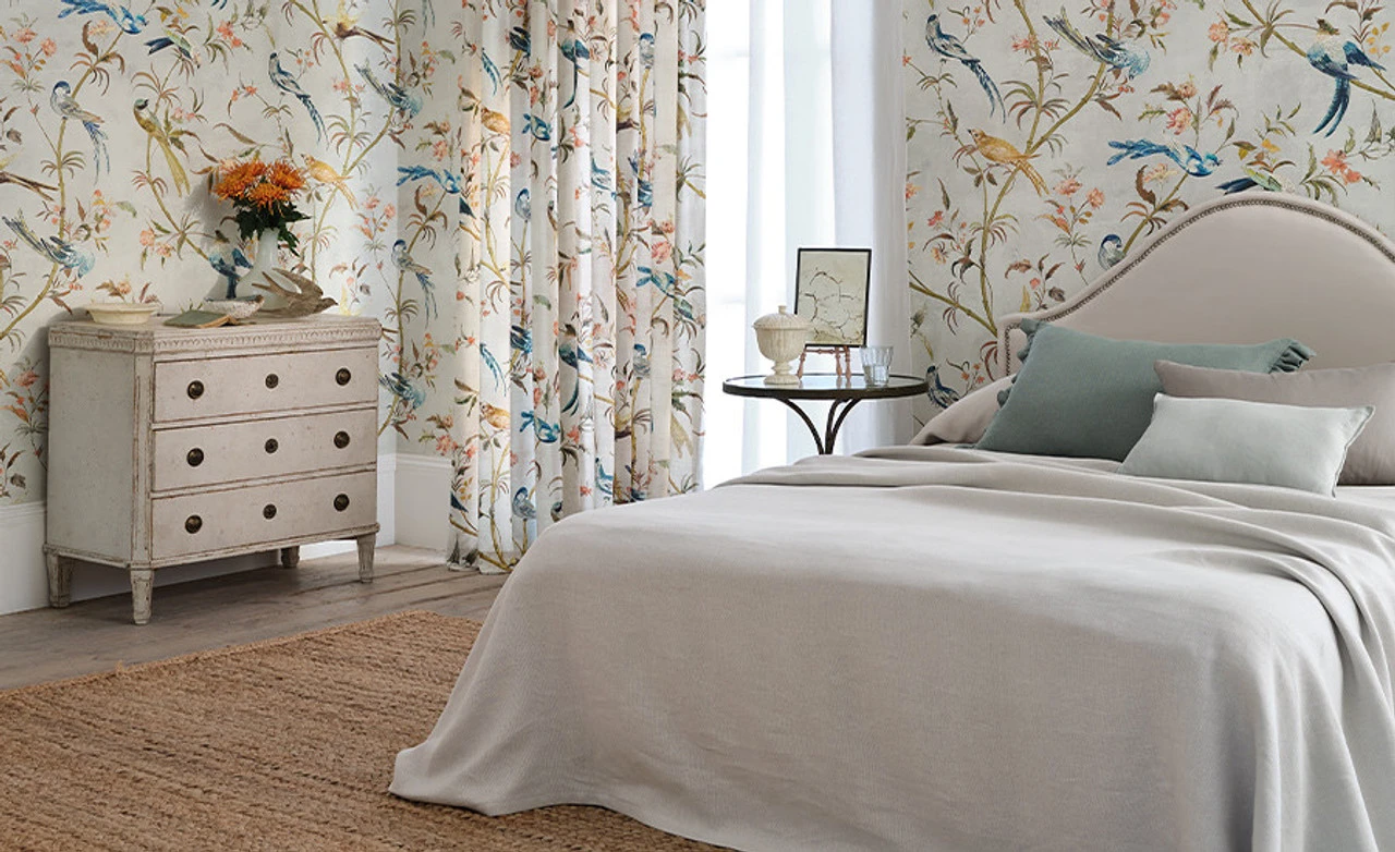 A captivating design, W444/02 Pluma Wallpaper by Romo features an uplifting exotic design with graceful birds perched on delicate branches. Presented in a rich colour palette and printed on both matt and pearlescent grounds Romo Pluma wallpaper is perfect for adding a tropical feel to the home interior. Printed on a non-woven substrate for ease of application, W444/02 Pluma wallpaper is shown here on a matt background in colour Olivine.