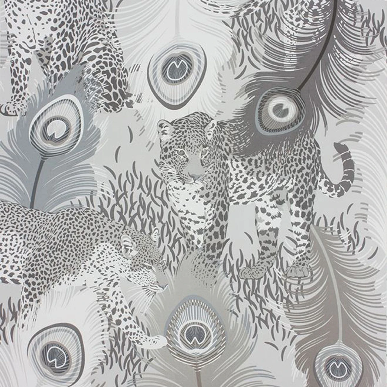 W6805-03 Leopardo Wallpaper by Matthew Williamson is a captivating, quirky wallpaper print depicting leopards prowling amonst abundant peacock feathers. Presented in a vibrant colour palette, Leopardo wallpaper is finished in a shimmering metallic background for added luxury. Shown here in shades of Grey and Silver.