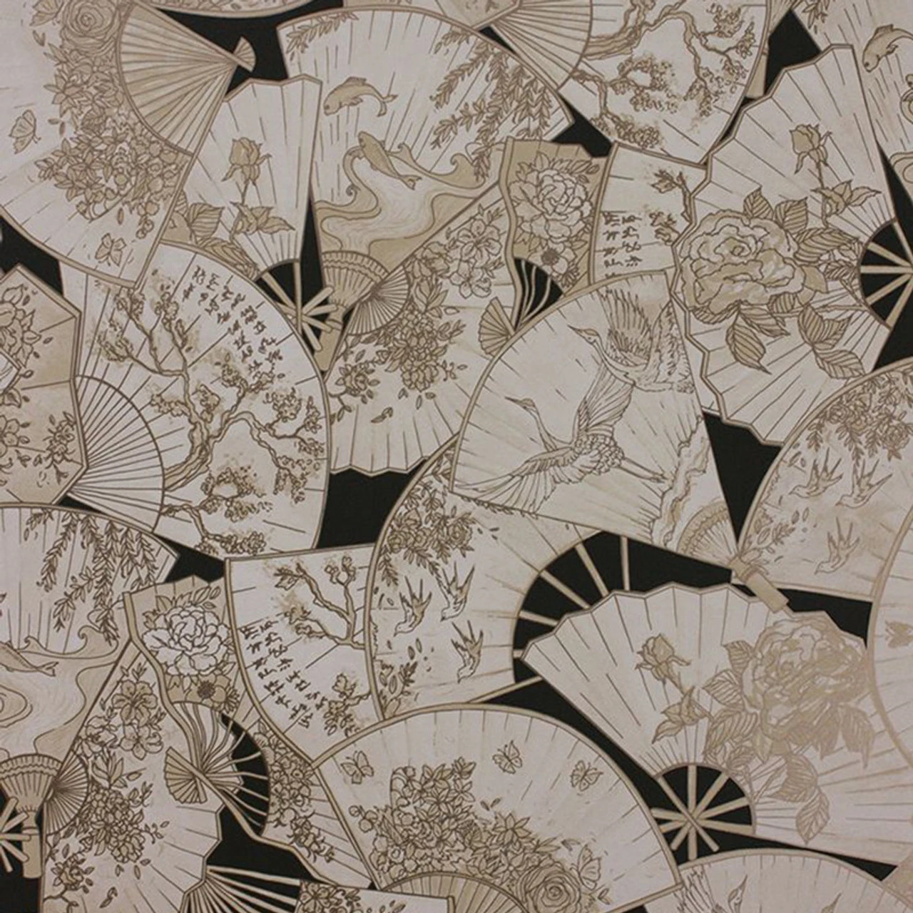 W7146/05 Fanfare Belvoir Wallpaper by Matthew Williamson features a stunning oriental design of beautifully detailed fans featuring Japanese blossoms, birds, trees and butterflies enhanced with metallic detailing, shown here in Black / Cream / Gold