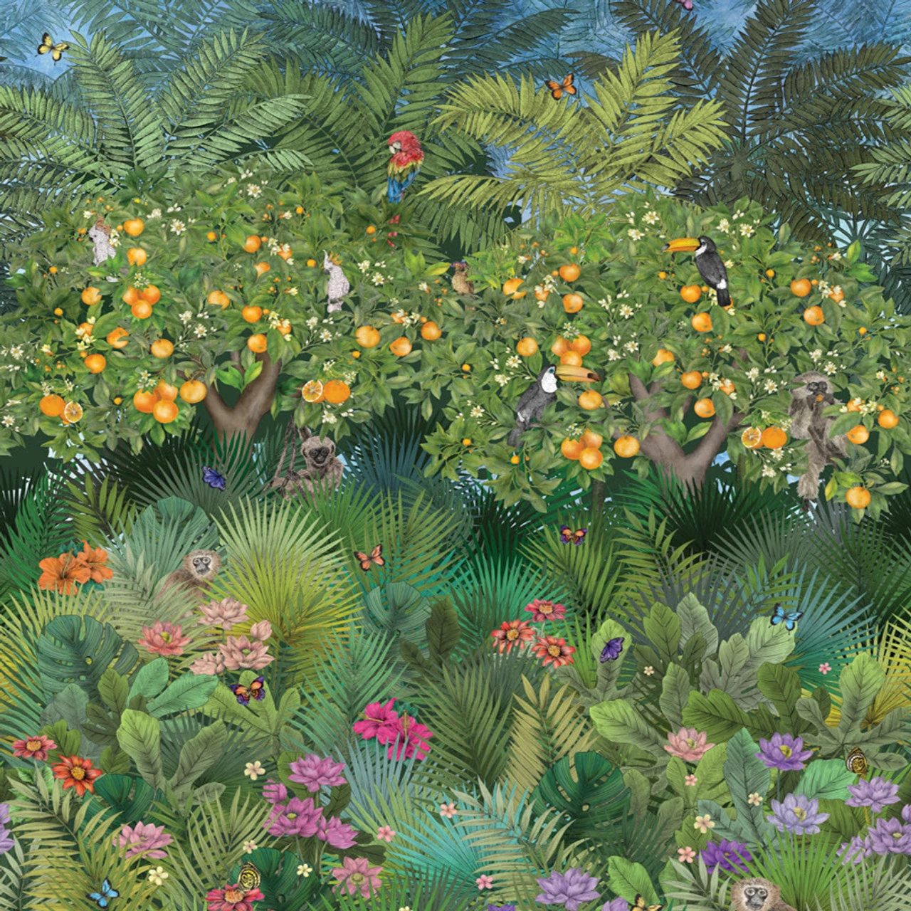 W7493-01 Orange Grove Wallpaper By Matthew Williamson is an awe inspiring wall panel, featuring an abundance of foliage and tropical florals set against a dense, lush botanical backdrop. Including depictions of jungle animals, Orange Grove is perfect for adults and children alike!