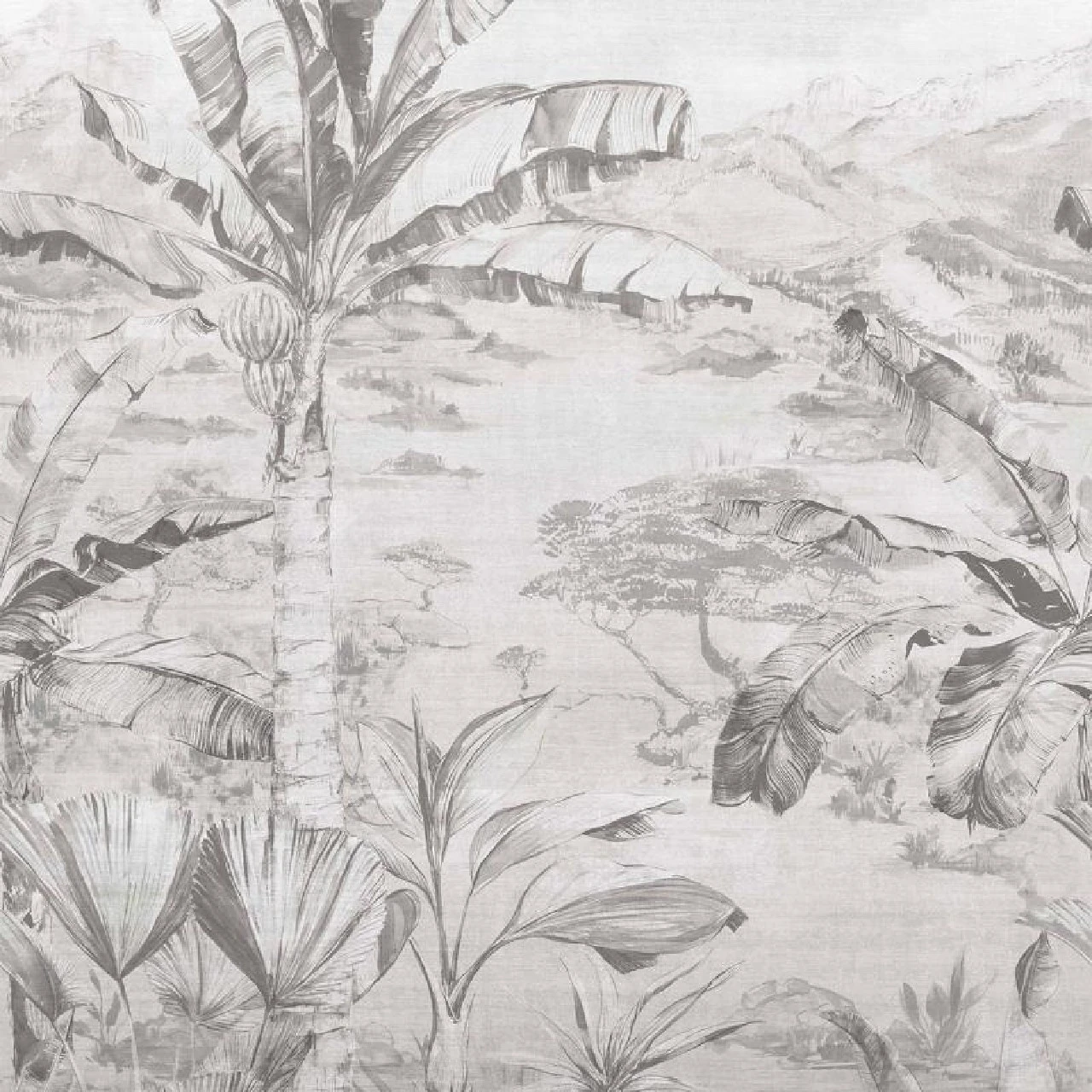 A glorious panoramic vista, W7615-03 Martinique wall mural from the Empyrea wallpaper collection by Osborne & Little features lush tropical foliage and palm trees set against a mountainous backdrop. Presented in three delightful colourways, Empyrea Martinique wall mural is certain to add a captivating feel to the home interior and is shown here in Graphite.