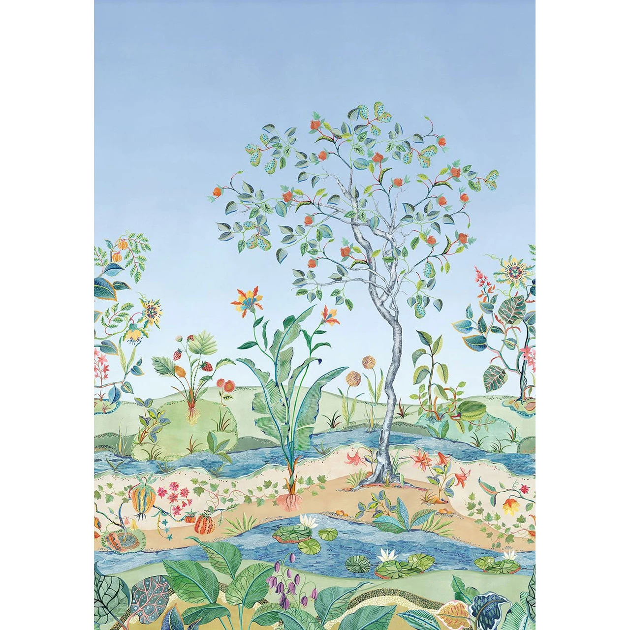 Transport the interior into a mystical haven with W7817-01 Mythica Mural from the Rhapsody collection by Osborne and Little. Depicting imaginary trees and plants, surrounded by exquisite flowers and fruit flowing on the bank of meandering streams. Mythica Mural allows the viewer to use their imagination and is a whimsical interpretation of a botanical scene. Presented against either dawn sky or azure blue backdrops to achieve a serene feel to the design. Shown here in Azure.